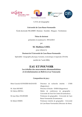 Mathieu Uhel. Eau et pouvoir. Les échelles des mouvements contestataires et révolutionnaires en Bolivie et au Venezuela. Géographie. Université de Caen, 2013. Français. ⟨tel-00952142⟩