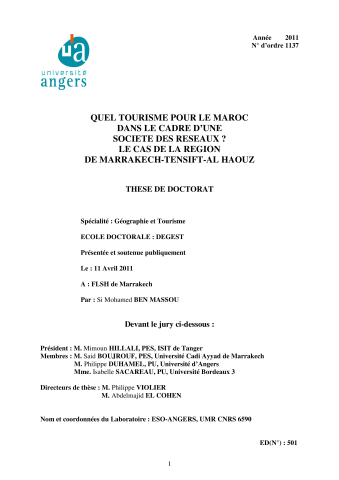 Si Mohamed Ben Massou. QUEL TOURISME POUR LE MAROC DANS LE CADRE D'UNE SOCIETE DES RESEAUX ? LE CAS DE LA REGION DE MARRAKECH-TENSIFT-AL HAOUZ. Géographie. Université d'Angers, 2011. Français. ⟨tel-00661366⟩