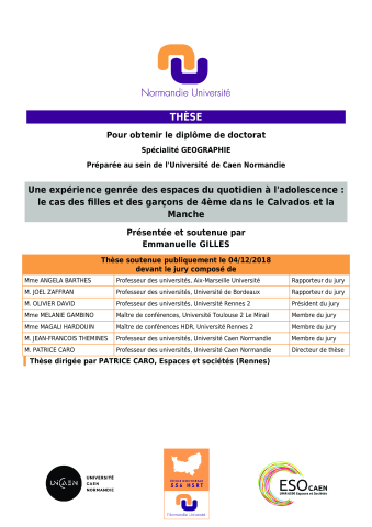 Emmanuelle Gilles. Une expérience genrée des espaces du quotidien à l'adolescence : le cas des filles et des garçons de 4ème dans le Calvados et la Manche. Géographie. Normandie Université, 2018. Français. ⟨NNT : 2018NORMC035⟩. ⟨tel-02145167v2⟩