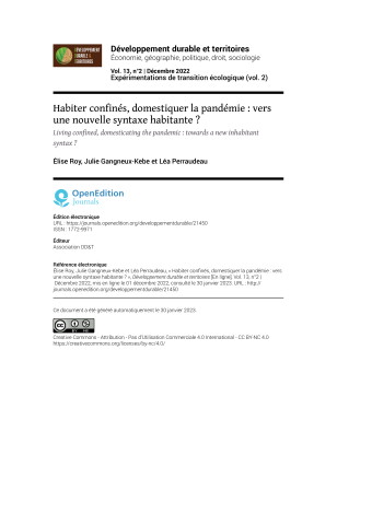 S’appuyant sur l’analyse des observations détaillées d’un « habiter confiné » réalisées par des étudiants en école d’architecture, cet article veut documenter le vécu de la pandémie, véritable épreuve collective remettant en question les rapports entretenus à nos espaces quotidiens qui sont autant matériels que sociaux. Si les analyses conduites ici viennent souligner des phénomènes déjà connus, elles mettent aussi en évidence des appropriations renouvelées qui pourront s’inscrire durablement dans une nouvelle « syntaxe habitante », faisant de la place au télétravail, et soutenant un rapport à l’extérieur révélé dans toute son importance. En nous privant d’un répertoire spatial large, le confinement nous a menés à recomposer nos territorialités et à une évaluation inédite de notre cadre matériel et de la valeur de nos spatialités.