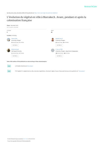 Salima Salhi, Abdelali Gourfi, Wafaa Benhsain, Aude Nuscia Taïbi, Said Boujrouf, et al.. L’évolution du végétal en ville à Marrakech. Avant, pendant et après la colonisation française. Le végétal dans les villes coloniales. Enjeux patrimoniaux et de qualité de vie, Nov 2022, Angers - France, France. ⟨10.13140/RG.2.2.10391.04008⟩. ⟨hal-03933771⟩
