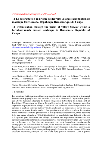 Christophe Demichelis, Johan Oszwald, Clélia Gasquet-Blanchard, Victor Narat, Jean-Christophe Bokika, et al.. La déforestation au prisme des terroirs villageois en situation de mosaïque forêt-savane, République Démocratique du Congo. VertigO : La Revue Électronique en Sciences de l'Environnement, 2022, 22 (2), ⟨10.4000/vertigo.36304⟩. ⟨hal-03988430v2⟩