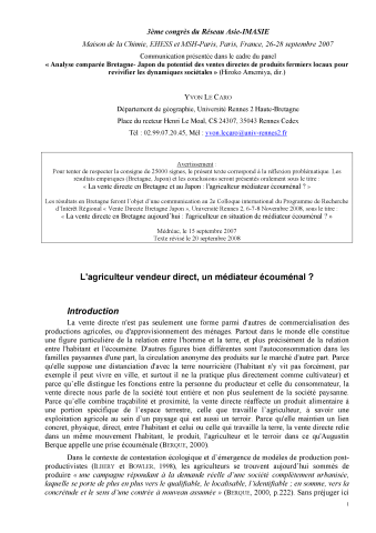 Yvon Le Caro. L'agriculteur vendeur direct, un médiateur écouménal ?. 3ème congrès du Réseau Asie-IMASIE, EHESS; MSH-Paris, Sep 2007, Paris, France. ⟨halshs-04348077⟩