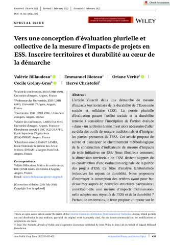 Valérie Billaudeau, Emmanuel Bioteau, Oriane Vérité, Cécile Grémy‐gros, Hervé Christofol. Vers une conception d’évaluation plurielle et collective de la mesure d'impacts de projets en ESS. Inscrire territoires et durabilité au cœur de la démarche. Annals of Public and Cooperative Economics, 2022, 93 (2), pp.435-455. ⟨10.1111/apce.12372⟩. ⟨hal-03759955⟩