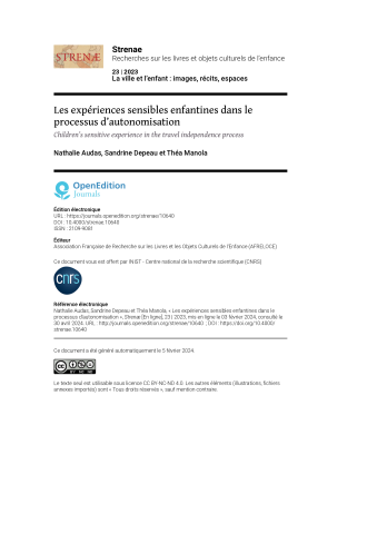 Nathalie Audas, Sandrine Depeau, Théa Manola. Les expériences sensibles enfantines dans le processus d’autonomisation. Strenae - Recherches sur les livres et objets culturels de l’enfance, 2023, 23, ⟨10.4000/strenae.10640⟩. ⟨hal-04564422⟩