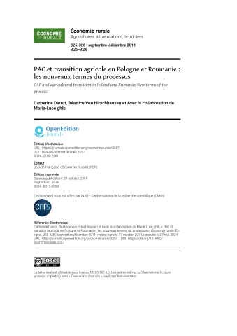 Béatrice von Hirschhausen, Marie Luce Ghib, Catherine Darrot. PAC et transition agricole en Pologne et Roumanie : les nouveaux termes du processus. Economie Rurale, 2011, Vingt ans de transition agricoles et rurales à l'Est, 325-326, pp.69-84. ⟨10.4000/economierurale.3257⟩. ⟨hal-01060535⟩