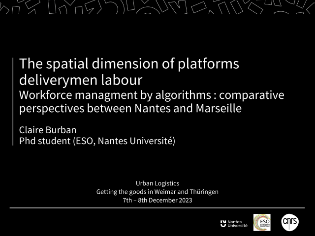 Claire Burban. The spatial dimension of platforms deliverymen labour. Workforce managment by algorithms : comparative perspectives between Nantes and Marseille (France). Journée d’études « Stadtlogistik. Waren in Bewegung in Weimar and Thüringen », Dec 2023, Weimar - Bauhaus Universität, Germany. ⟨hal-04726236⟩