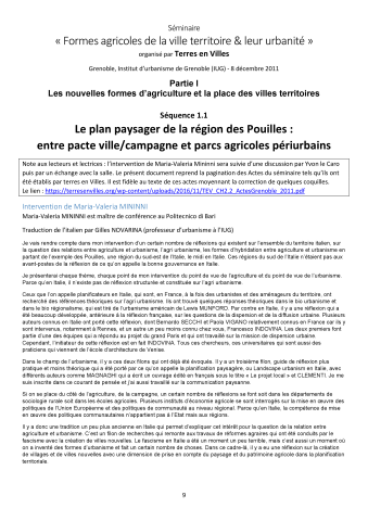 As part of the FAFU (Formes agricoles et formes urbaines dans la ville-territoire) project, the Terres en Villes association invited Maria Valeria Mininni to present the rationale behind the landscape plan for the Puglia region (Italy). She explained the conditions under which the plan was drawn up as part of the territorialist approach led by Alberto Magnaghi, the desire to balance the urban, agricultural and natural rationalities of the region, and the expectations of the town-country pact that enabled the plan to survive beyond its adoption, albeit not without difficulties. Yvon Le Caro was invited to discuss this paper. He repositioned the notions of centre and periphery in terms of the relationship between the countryside and towns in the rural context, and raised the question of the place of minority positions in the planning process. He points out that the balance between zoning and multifunctionality, the strength of representations and aspirations, and the complexity of uses all impact on the normativity of the recommendations. He concludes with a discussion of the relationship between the local authorities responsible for these plans and the local players involved, between voluntarism and regulation. The text proposed in the seminar proceedings corresponds to the minutes and iconography of this session, including the exchanges with the audience.