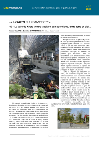 Gérald Billard, Stanislas Charpentier. « LA PHOTO QUI TRANSPORTE » 40 -La gare de Kyoto : entre tradition et modernisme, entre terre et ciel…. Géotransports, 2024, 22, pp.131. ⟨halshs-04919825⟩