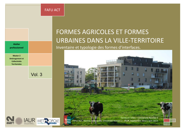 As part of the FAFU project (Formes agricoles et formes urbaines dans la ville-territoire - Agricultural and urban shapes in the city-territory), Rennes Métropole commissioned a group of students to establish a typology of agri-urban interfaces in the Rennes conurbation, to establish the links between their forms and functions and to make recommendations for more integrated development of urban and agricultural spaces in the communes. The first volume sets out the methodology and results of the typological study: 12 types are defined, characterised and mapped. The second volume describes the interfaces of 8 communes in the light of the proposed typology, and looks in more detail at seven cross-cutting issues: urban sprawl; farming practices; agricultural landscapes; communication; traffic and safety; hamlets; community gardens. The final volume summarises the study and makes a number of recommendations.