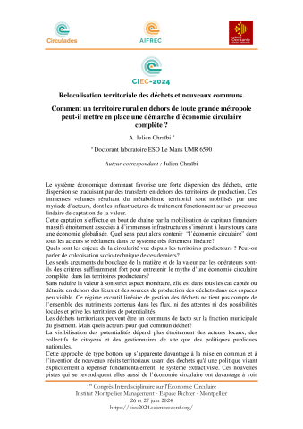 Julien Chraïbi. Relocalisation territoriale des déchets et nouveaux communs. Comment un territoire rural en dehors de toute grande métropole peut-il mettre en place une démarche d'économie circulaire complète ?. Congrès Interdisciplinaire sur l’Economie Circulaire CIEC-2024, Jun 2024, Montpellier, France. ⟨hal-04968387⟩