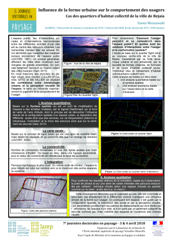 Since the housing crisis of the 1970s, Algeria has adopted new planning instruments to support social housing projects. Why is it that, after so many initiatives, social housing programmes are not delivering the expected results? These neighbourhoods quickly become hotbeds of delinquency, with outdoor areas transformed into lawless territories, and we will study this phenomenon in order to understand its causality. We will focus on the correlation between urban morphology in social housing neighbourhoods and behaviour in order to understand ‘How does the built environment influence user behaviour’, in terms of orientation, movement, safety and incivility. This study is divided into two parts:1. a review of the state of the art to identify the various concepts and previous work on the subject;2. a practical part comprising an urban analysis of the neighbourhoods to determine the various indicators to be addressed in the social survey. Secondly, we opt for spatial syntax as a tool for spatial modelling of different social phenomena. Thirdly, the use of the most advanced computer modelling methods (virtual environments, fuzzy logic) combined with new social survey methods in order to judge the effectiveness of the method and to provide additional information not supported by spatial syntax. The aim is to demonstrate the relationship between spatial structure and the function of built and urban environments, to understand spatial complexity, to study and measure spatial configurations, to analyse spatial structures and emerging patterns, and finally to understand space as a variable, to seek a certain logic, to measure, analyse, simulate and plan.