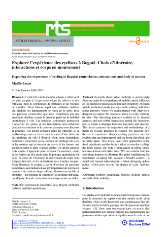 Les recherches sur la mobilité urbaine s’intéressent de plus en plus à l’expérience vécue de celle-ci et son influence dans la constitution de pratiques et de routines de mobilité. Nous faisons appel aux méthodes mobiles qui étudient les déplacements en train de se faire, avec des parcours commentés, que nous complétons par des entretiens, destinés à saisir le discours porté sur la mobilité quotidienne à vélo. Les parcours commentés permettent d’observer les gestes et les interactions non-verbalisés pendant les entretiens et de créer un dialogue entre discours et pratique. Cet article présente donc les objectifs et la méthodologie mis en œuvre dans le cadre d’une thèse sur les pratiques du vélo à Bogotá. Nous nous demandons comment l’expérience vécue façonne les pratiques du vélo et les routines qui se mettent en œuvre et les formes que prennent celles-ci dans l’espace public. Cet article propose trois angles d’approche pour évoquer l’expérience vécue et les formes qu’elle prend dans la pratique quotidienne du vélo : le choix de l’itinéraire, le mouvement du corps dans l’espace traversé, et les interactions avec d’autres usagers. Nous illustrons le propos à partir d’extraits de parcours commentés, qui mettent en avant l’importance de la prise en compte d’un contexte large – d’une infrastructure sociale et humaine – au moment de concevoir la politique publique, qui dépasse la seule conception d’aménagements cyclables.