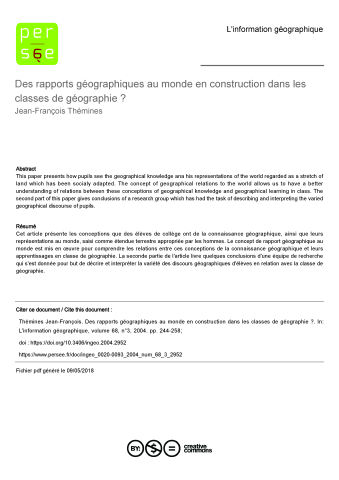 Jean-François Thémines. Des rapports géographiques au monde en construction dans les classes de géographie ?. L'Information géographique, 2004, 68, pp.244 - 258. ⟨10.3406/ingeo.2004.2952⟩. ⟨halshs-05090074⟩