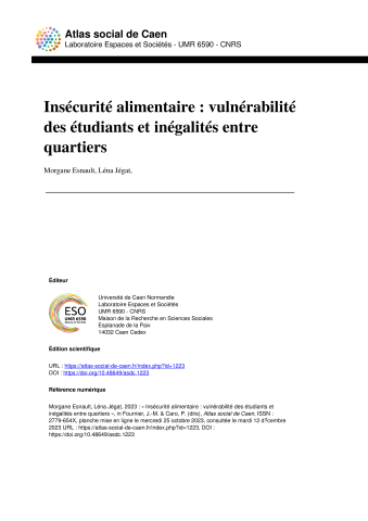 Lire le document sur https://atlas-social-de-caen.fr/index.php?id=1223 La crise sanitaire et le contexte d’inflation, notamment des produits alimentaires, interrogent : quelles sont aujourd’hui les nouvelles conditions d’accès à l’alimentation ? Les populations isolées, âgées ou étudiantes sont connues comme étant les plus à risque d’insécurité dans leurs apports alimentaires. Une enquête par questionnaire réalisée par les étudiants et étudiantes de géographie de l’Université de Caen Normandie en 2021 indique que 24 % des étudiants déclarent diminuer leur nombre de repas pour des raisons financières.