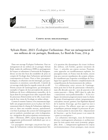 Fanny Romain. Sylvain Rode, Écologiser l’urbanisme. Pour un ménagement de nos milieux de vie partagés, Bordeaux, Le Bord de l’eau, 216 p. Norois. Environnement, aménagement, société, 2024, 272, pp.103-104. ⟨10.4000/12tdj⟩. ⟨hal-04998075⟩