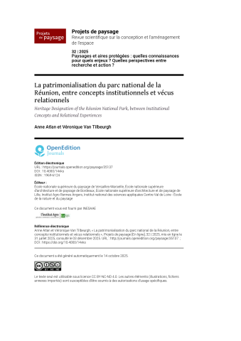 Anne Atlan, Véronique van Tilbeurgh. Heritage Designation of the Réunion National Park, between Institutional Concepts and Relational Experiences. Projets de paysage : revue scientifique sur la conception et l'aménagement de l'espace, 2025, 32, ⟨10.4000/14vks⟩. ⟨hal-05394983⟩