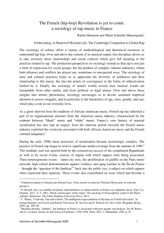Karim Hammou, Marie Sonnette-Manouguian. The French (Hip-Hop) Revolution Is Yet to Come: a sociology of rap music in France. Richard Bramwell; Alex de Lacey. The Cambridge Companion to Global Rap, Cambridge University Press, pp.113-124, 2025, 9781009099738. ⟨10.1017/9781009099738.008⟩. ⟨hal-05475341⟩