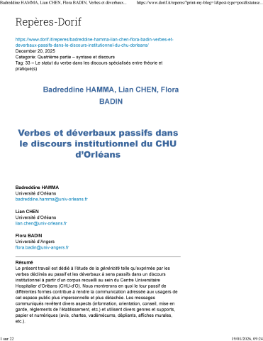 Badreddine Hamma, Lian Chen, Flora Badin. Verbes et déverbaux passifs dans le discours institutionnel du CHU d’Orléans. Repères-Dorif. Autour du français : langues, cultures et plurilinguisme, 2025, Le Statut du verbe dans les discours spécialisés entre théorie et pratique(s) (33), pp.1-23. ⟨hal-05462992⟩