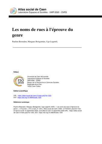 Pauline Bosredon, Margaux Boisgontier, Ugo Legentil. Les noms de rues à l’épreuve du genre. Atlas Social de Caen : de l'agglomération à la métropole ?, 2025, https://atlas-social-de-caen.fr/index.php?id=1325. ⟨10.48649/asdc.1325⟩. ⟨hal-05481145⟩