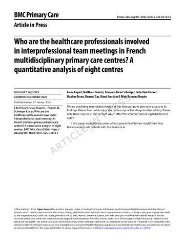 Laure Fiquet, Matthieu Peurois, François-Xavier Schweyer, Sébastien Fleuret, Maxime Esvan, et al.. Who are the healthcare professionals involved in interprofessional team meetings in French multidisciplinary primary care centres? A quantitative analysis of eight centres. BMC Primary Care, In press, Online ahead of print. ⟨10.1186/s12875-025-03142-z⟩. ⟨hal-05455744⟩
