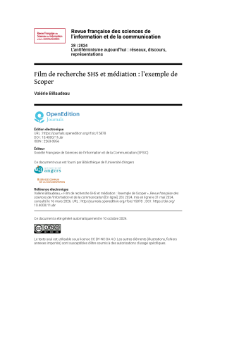 Valérie Billaudeau. Film de recherche SHS et médiation : l’exemple de Scoper. Revue française des sciences de l'information et de la communication, 2024, 28, ⟨10.4000/11ubr⟩. ⟨hal-05554998⟩