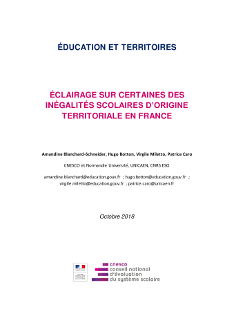 Amandine Blanchard-Schneider, Hugo Botton, Virgile Miletto, Patrice Caro. Éducation et territoires, éclairage sur certaines des inégalités scolaires d'origine territoriale en France. [Rapport de recherche] CNESCO (Conseil national d'évaluation du système scolaire). 2018. ⟨halshs-01915642⟩