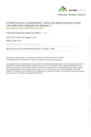 Jean-Baptiste Bahers, Mathieu Durand. Le retour de la proximité ! Quelles implications pour les services urbains en réseau ?. Flux - Cahiers scientifiques internationaux Réseaux et territoires, 109-110 (3), 2017, ⟨10.3917/flux1.109.0001⟩. ⟨halshs-01873434⟩