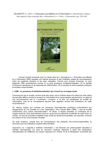 Eric Delamotte. L’Education aux Médias et à l’Information. Dictionnaire critique des enjeux et des concepts des « éducations à », 2017. ⟨hal-02319542⟩