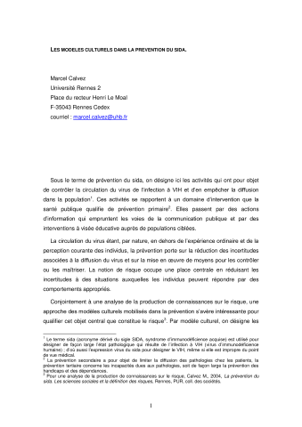 Marcel Calvez. Les modèles culturels dans la prévention du sida. Brigitte Bouquet. La prévention: concepts, politiques, pratiques en débat, L'Harmattan, pp.33-44, 2005, Logiques sociales. Cahiers du GRIOT. ⟨halshs-00483469⟩