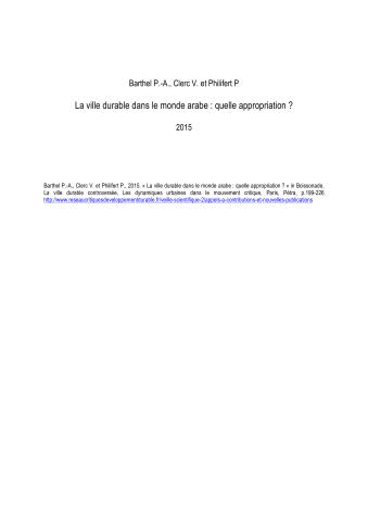 Pierre-Arnaud Barthel, Valérie Clerc, Pascale Philifert. La « ville durable » dans le monde arabe : quelle appropriation?. La ville durable controversée, Les dynamiques urbaines dans le mouvement critique, 2015. ⟨halshs-02021407⟩
