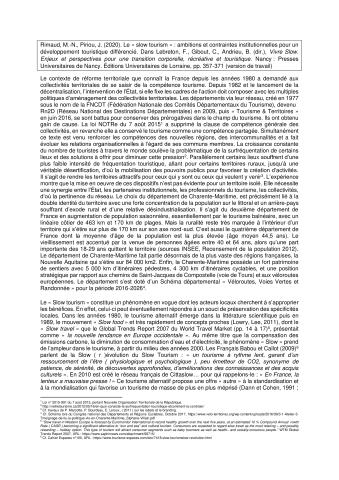 Marie-Noëlle Rimaud, Jérôme Piriou. Le « slow tourism » : ambitions et contraintes institutionnelles pour un développement touristique différencié. Presses Universitaires de Nancy - Editions Universitaires de Lorraine. Vivre Slow. Enjeux et perspectives pour une transition corporelle, récréative et touristique, Presses Universitaires de Nancy - Editions Universitaires de Lorraine, pp.357-371, 2020, 978-2-8143-0568-7. ⟨halshs-02925968⟩