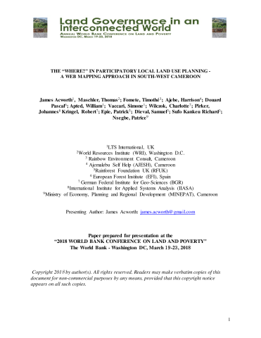 James Acworth, Thomas Maschler, Timothé Fomete, Harrison Ajebe, Douard Pascal, et al.. THE "WHERE?" IN PARTICIPATORY LOCAL LAND USE PLANNING - A WEB MAPPING APPROACH IN SOUTH-WEST CAMEROON. 2018 WORLD BANK CONFERENCE ON LAND AND POVERTY”, Mar 2018, WASHINGTON, DC, United States. ⟨halshs-02354535⟩