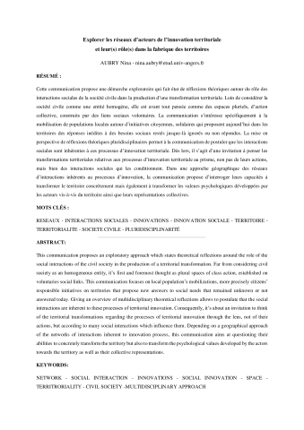 Explorer les réseaux d'acteurs de l'innovation territoriale et leur(s) rôle(s) dans la fabrique des territoires