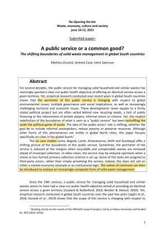 Mathieu Durand, Jérémie Cavé, Irène Salenson. A public service or a common good? The shifting boundaries of solid waste management in global South countries. Re-opening the bin - Waste, economy, culture and society, Gothenburg university, Jun 2021, Göteborg [en ligne], Sweden. ⟨hal-03518038⟩