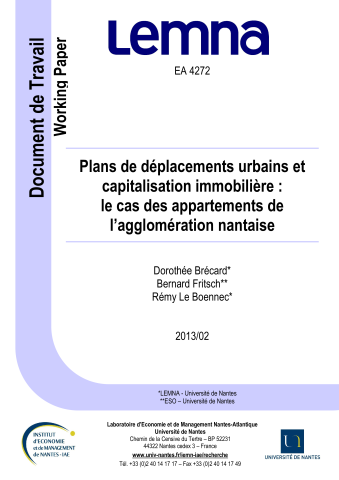 Dorothée Brécard, Bernard Fritsch, Rémy Le Boennec. Plans de déplacements urbains et capitalisation immobilière : le cas des appartements de l'agglomération nantaise.. 2013. ⟨hal-00781966⟩