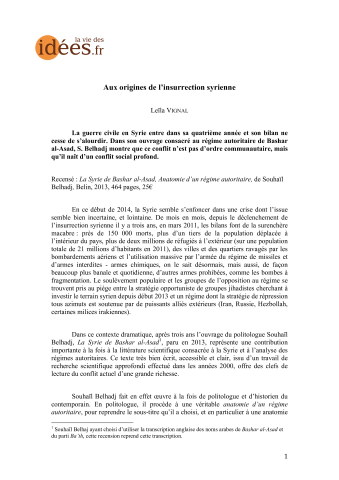 Leila Vignal. Aux origines de l’insurrection syrienne : à propos de : La Syrie de Bashar al-Asad. Anatomie d’un régime autoritaire, de Souhaïl Belhadj, Belin, 2013. 2014. ⟨hal-02072492⟩