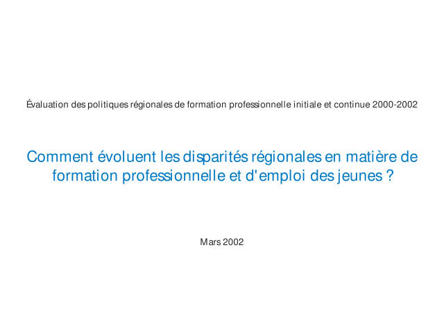 Céline Gasquet, Daniel Martinelli, Patrice Caro, Isabelle Przybylski, Jean Jacques Arrighi. Comment évoluent les disparités régionales en matière de formation professionnelle et d'emploi des jeunes en France ?. 2002, pp.67. ⟨halshs-00840515⟩