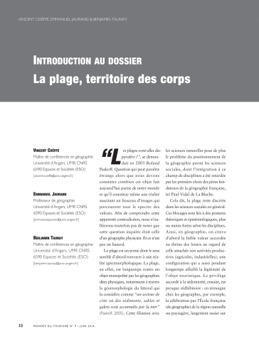 Vincent Coëffé, Emmanuel Jaurand, Benjamin Taunay. Introduction au dossier, la plage, territoire des corps. Mondes du tourisme, Paris: Éd. touristiques européennes, 2014, pp.32-41. ⟨10.4000/tourisme.135⟩. ⟨hal-03337746⟩