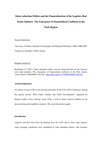 Nicolas Raimbault. Outer-suburban politics and the financialisation of the logistics real estate industry: The emergence of financialised coalitions in the Paris region. Urban Studies, SAGE Publications, 2021, pp.004209802110144. ⟨10.1177/00420980211014452⟩. ⟨hal-03506837⟩