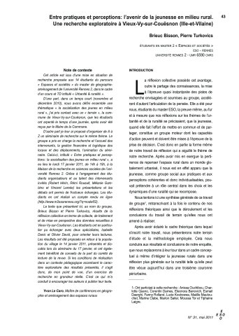 Brieuc Bisson, Pierre Turkovics. Entre pratiques et perceptions : l’avenir de la jeunesse en milieu rural. Une recherche exploratoire à Vieux-Vy-sur-Couesnon (Ille-et-Vilaine). ESO Travaux et Documents, Espaces et SOciétés - UMR 6590, 2011, pp.43-51. ⟨halshs-03188016⟩