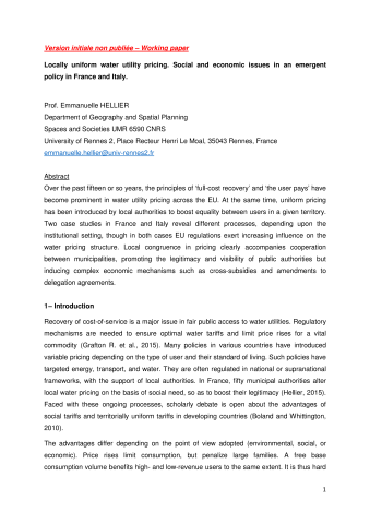 Emmanuelle Hellier. Locally uniform water utility pricing. Social and economic issues in an emergent policy in France and Italy. Geopolitical, social security and freedom journal, De Gruyter, 2019, 1 (1), pp.152-170. ⟨10.2478/gssfj-2018-0008⟩. ⟨halshs-01979139⟩
