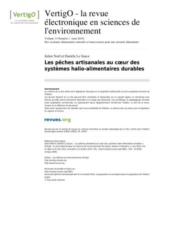 Julien Noel, Danièle Le Sauce. Des pêches artisanales au cœur de systèmes halio-alimentaires durables. VertigO : La Revue Électronique en Sciences de l'Environnement, VertigO, 2014, 14 (1). ⟨hal-01654388⟩