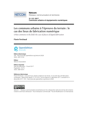 Flavie Ferchaud. Les communs urbains à l'épreuve du terrain : le cas des lieux de fabrication numérique. NETCOM : Réseaux, communication et territoires / Networks and Communications Studies, Netcom Association, 2017. ⟨hal-01715911⟩