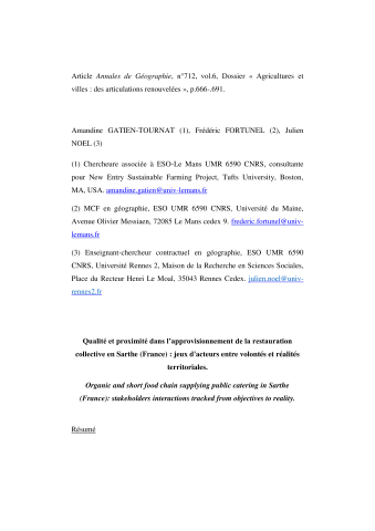 Amandine Gatien-Tournat, Frederic Fortunel, Julien Noel. Qualité et proximité dans l'approvisionnement de la restauration collective en Sarthe (France) : jeux d'acteurs entre volontés et réalités territoriales . Annales de géographie, Armand Colin, 2016, 6 (712), p.666-.691. ⟨hal-01654397⟩