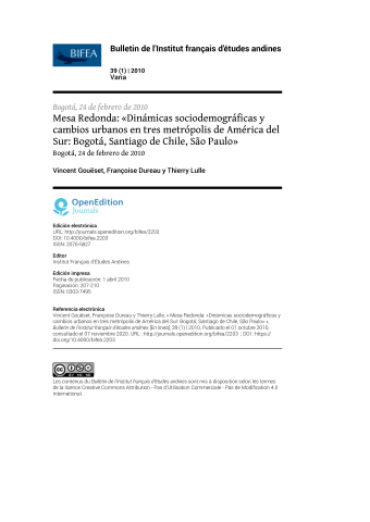 Vincent Gouëset, Françoise Dureau, Thierry Lulle. Mesa Redonda: «Dinámicas sociodemográficas y cambios urbanos en tres metrópolis de América del Sur: Bogotá, Santiago de Chile, São Paulo». Bulletin de l'Institut Francais d'Etudes Andines, Institut Français d'Etudes Andines (IFEA), 2010, pp.207-210. ⟨10.4000/bifea.2203⟩. ⟨halshs-03008684⟩