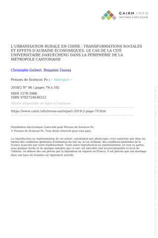 Christophe Guibert, Benjamin Taunay. L'URBANISATION RURALE EN CHINE : TRANSFORMATIONS SOCIALES ET EFFETS D'AUBAINE ÉCONOMIQUES. LE CAS DE LA CITÉ UNIVERSITAIRE DAXUECHENG DANS LA PÉRIPHÉRIE DE LA MÉTROPOLE CANTONAISE. Autrepart - Revue de sciences sociales au Sud, Presses de Sciences Po (PFNSP), 2018. ⟨halshs-03500836⟩