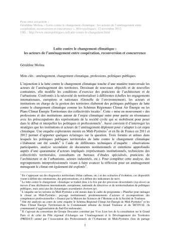 Géraldine Molina. Lutte contre le changement climatique : les acteurs de l’aménagement entre coopération, reconversion et concurrence. Métropolitiques.eu, Métropolitiques, 2012. ⟨hal-01845972⟩
