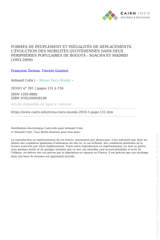 Françoise Dureau, Vincent Gouëset. Formes de peuplement et inégalités de déplacements. L'évolution des mobilités quotidiennes dans deux périphéries populaires de Bogotá : Soacha et Madrid (1993-2009). Revue Tiers Monde, Armand Colin, 2010, pp.131-156. ⟨halshs-00510384⟩