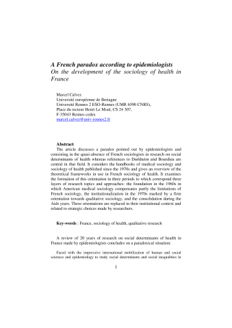 Marcel Calvez. A French paradox according to epidemiologists: On the development of the sociology of health in France. Salute e Sociéta, 2012, XI (2), pp.55-72. ⟨10.3280/SES2012-002005EN⟩. ⟨halshs-00746078⟩